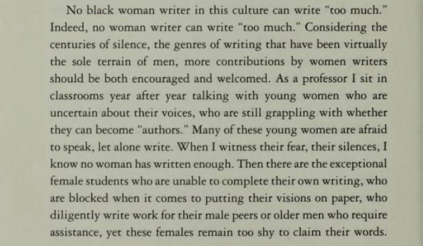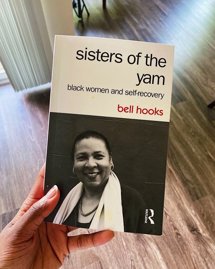 I first began to seriously engage with bell hooks in & outside the classroom when I came across Toni Cade Bambara’s infamous quote in The Salt Eaters, “just so’s you’re sure, sweetheart and ready to be healed, cause wholeness is no trifling matter. A lot of weight when you are well.” Her book, Sisters of the Yam: Black women and Self-Recovery, has been a sacred, healing read for me lately.